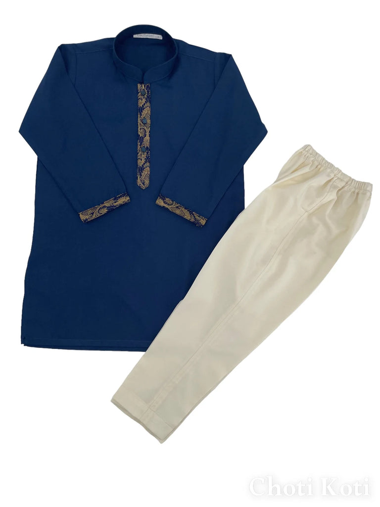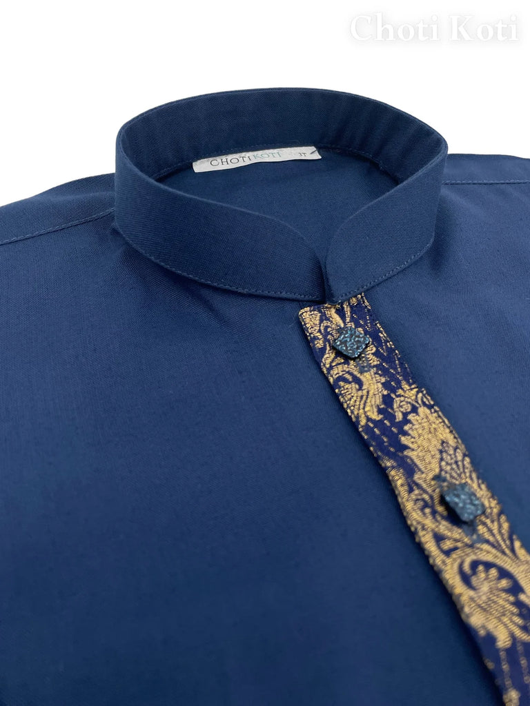 Blue Navy Zari Kurta: A true statement piece, this kurta combines traditional craftsmanship with modern style. Tailored in exquisite fabric, this kurta is adorned with metallic zari work that lends a delightful richness to the classic blue navy shade. The intricate work of zari is the perfect match for glamorous occasions and makes it suitable for Indian festive and cultural functions, weddings.