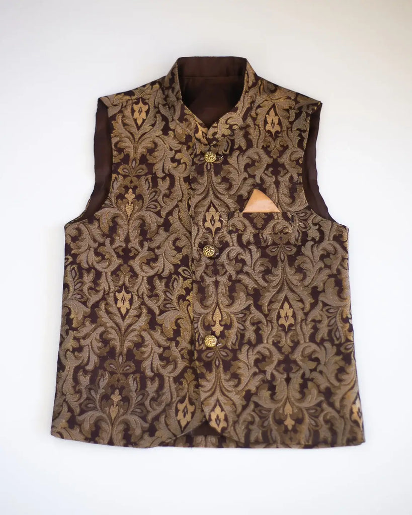 Our Nawab Rust Koti Set for Kids is the best way to make your little boy look like a prince. A combination of classic kurta and pajama with a regal koti is a design masterpiece. The prototype with its interesting koti is the star of casual and evening wear and can fit perfectly into all seasons, keeping your kid snug while never going out of trend.